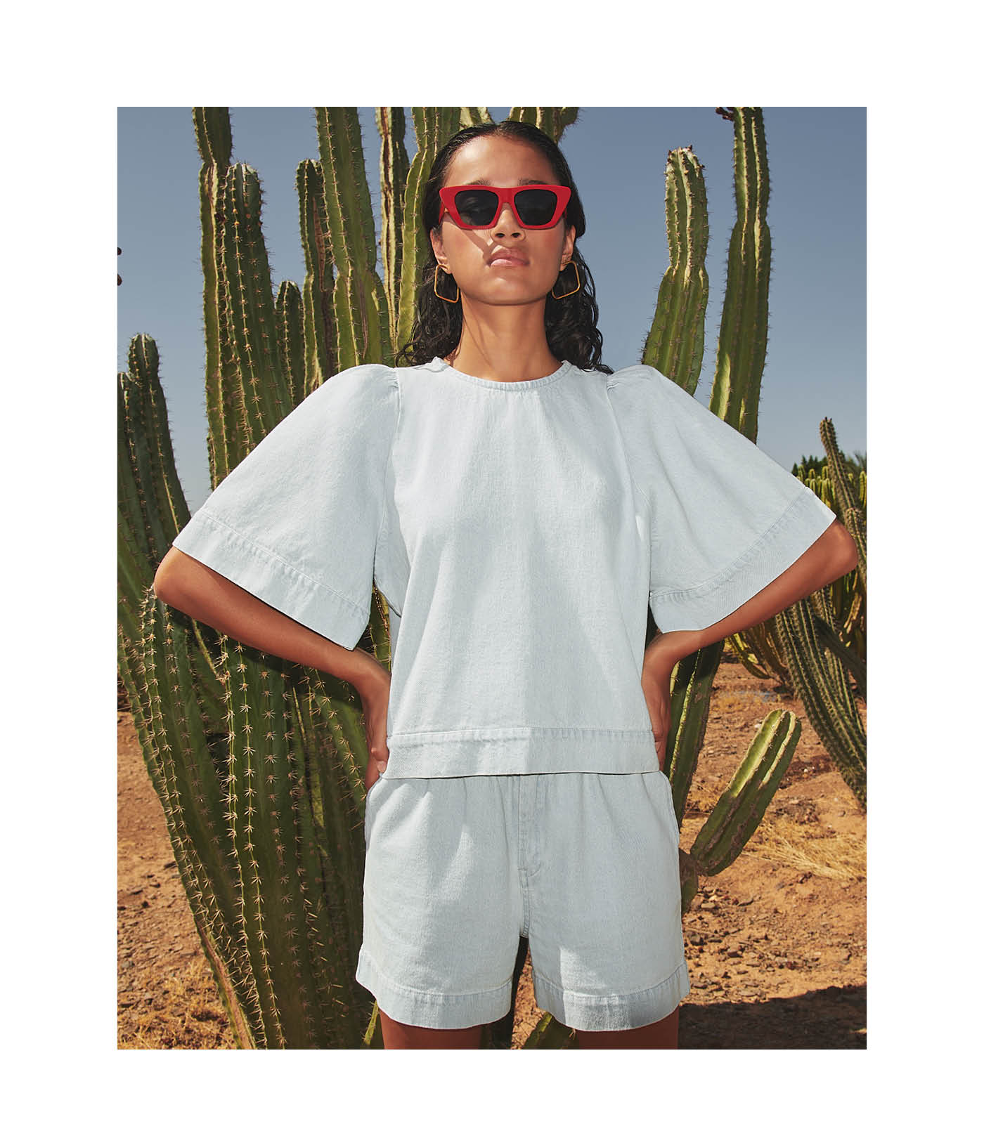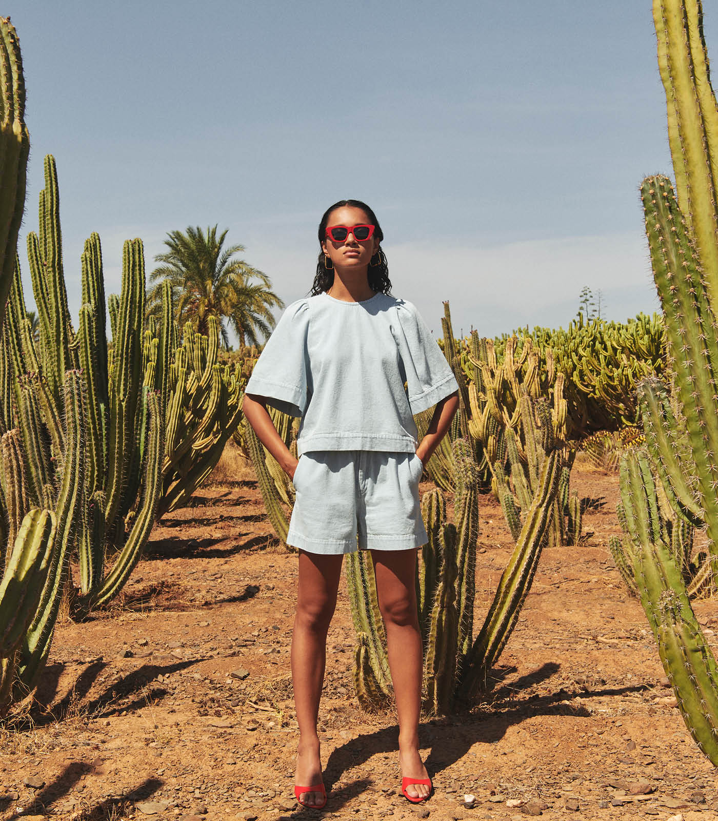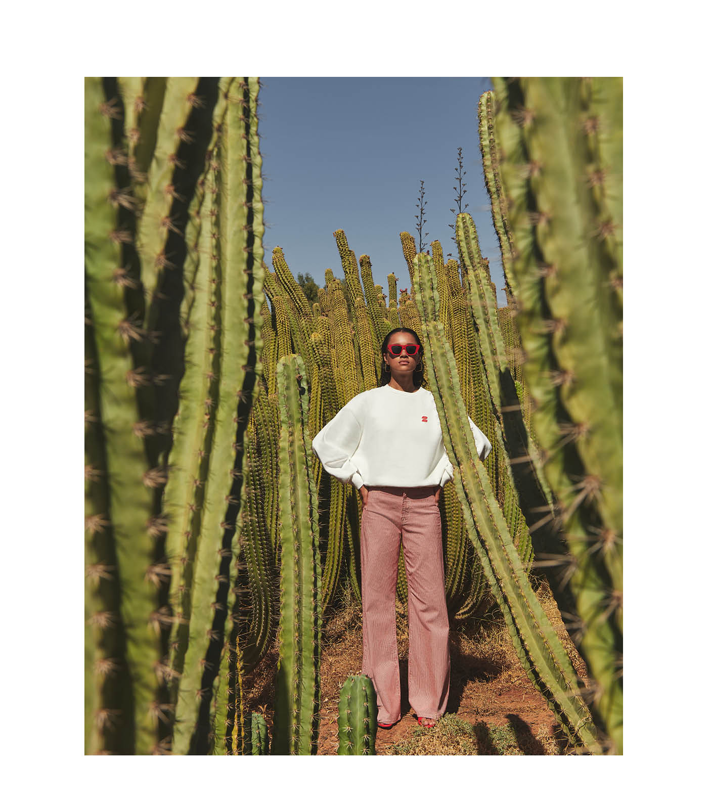 sunlit escape, where boldness meets calm. Amongst the towering cacti, the warmth of the Moroccan sun envelops everything in its glow, blending nature’s untamed beauty with effortless elegance.