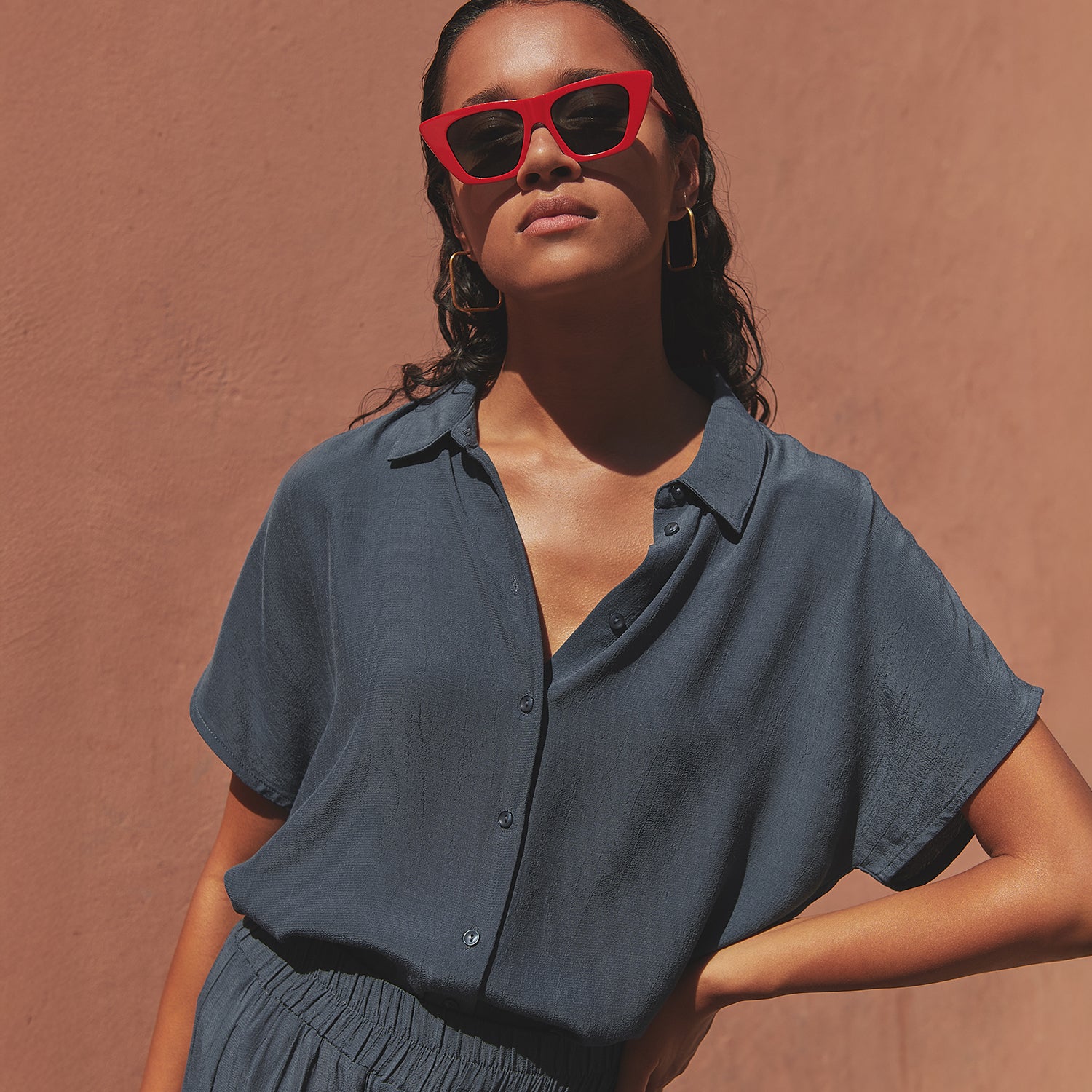 essentialsarah short pin stripe blouse | indi grey lifestyle imagesarah short pin stripe blouse indi grey lifestyle image