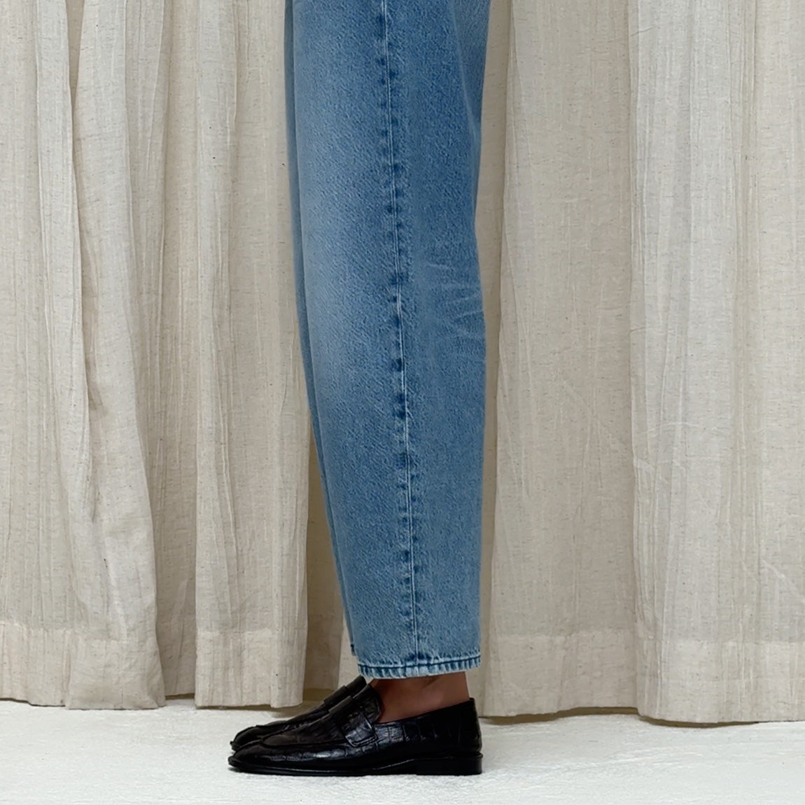 Wir empfehlen, Ihren Denim zwischen den Tragevorgängen zu lüften, das spart Wasser und Energie. Wenn Sie ihn waschen müssen, drehen Sie ihn immer auf links, verwenden Sie einen Kaltwaschgang mit einem Feinwaschmittel und waschen Sie ihn mit ähnlichen Farben, um die Farbe zu erhalten und das Ausbleichen zu reduzieren.