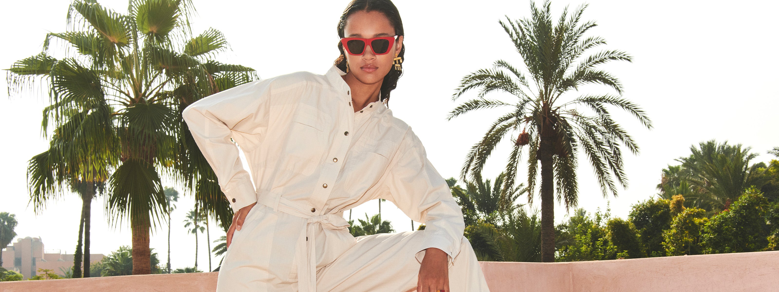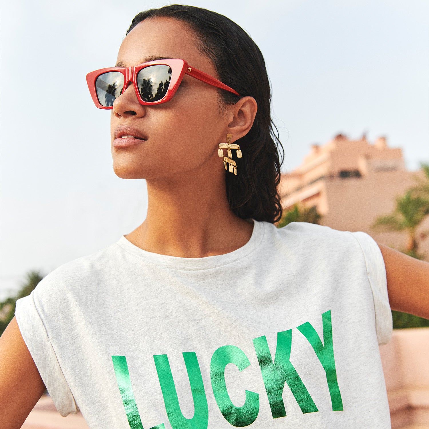 delicate details, flowing jumpsuits, off-shoulder tops, and the iconic Lucky Top in fresh shades define the season. Elevated with bold accessories, like statement sunglasses and fine jewellery.