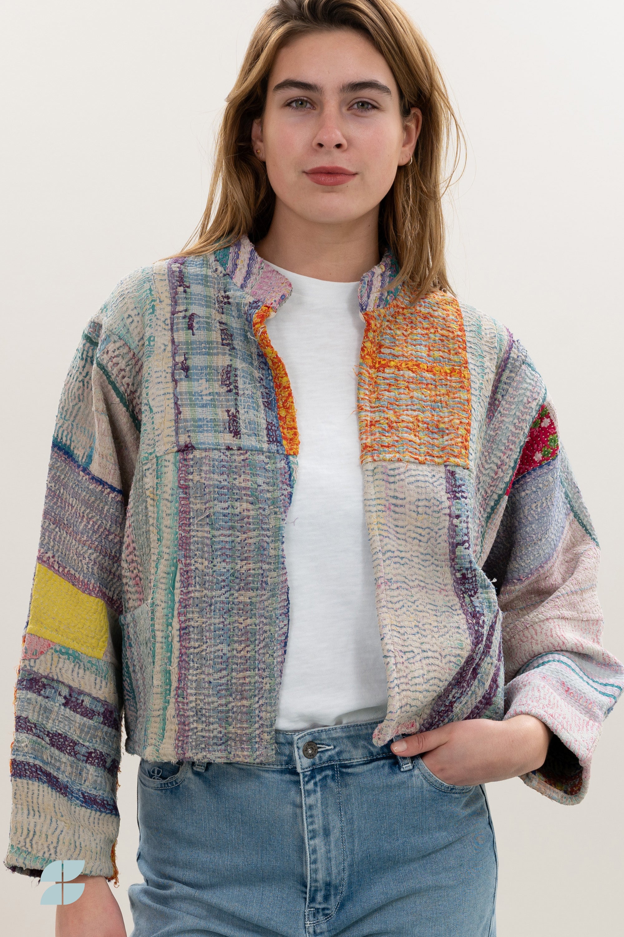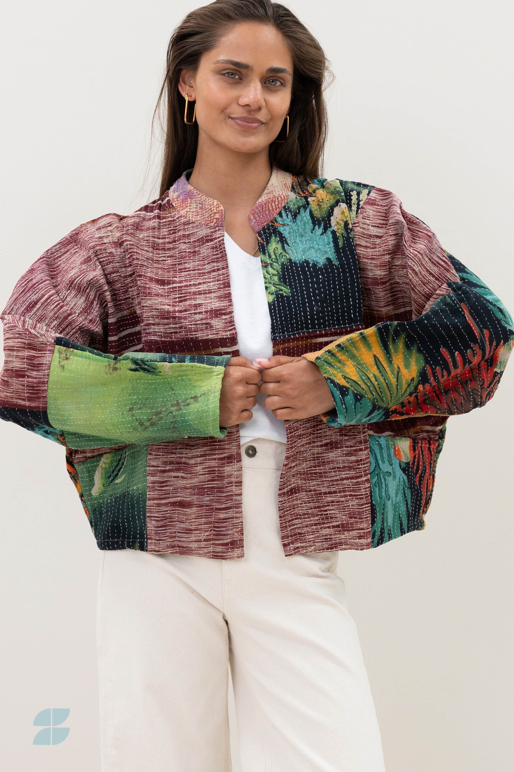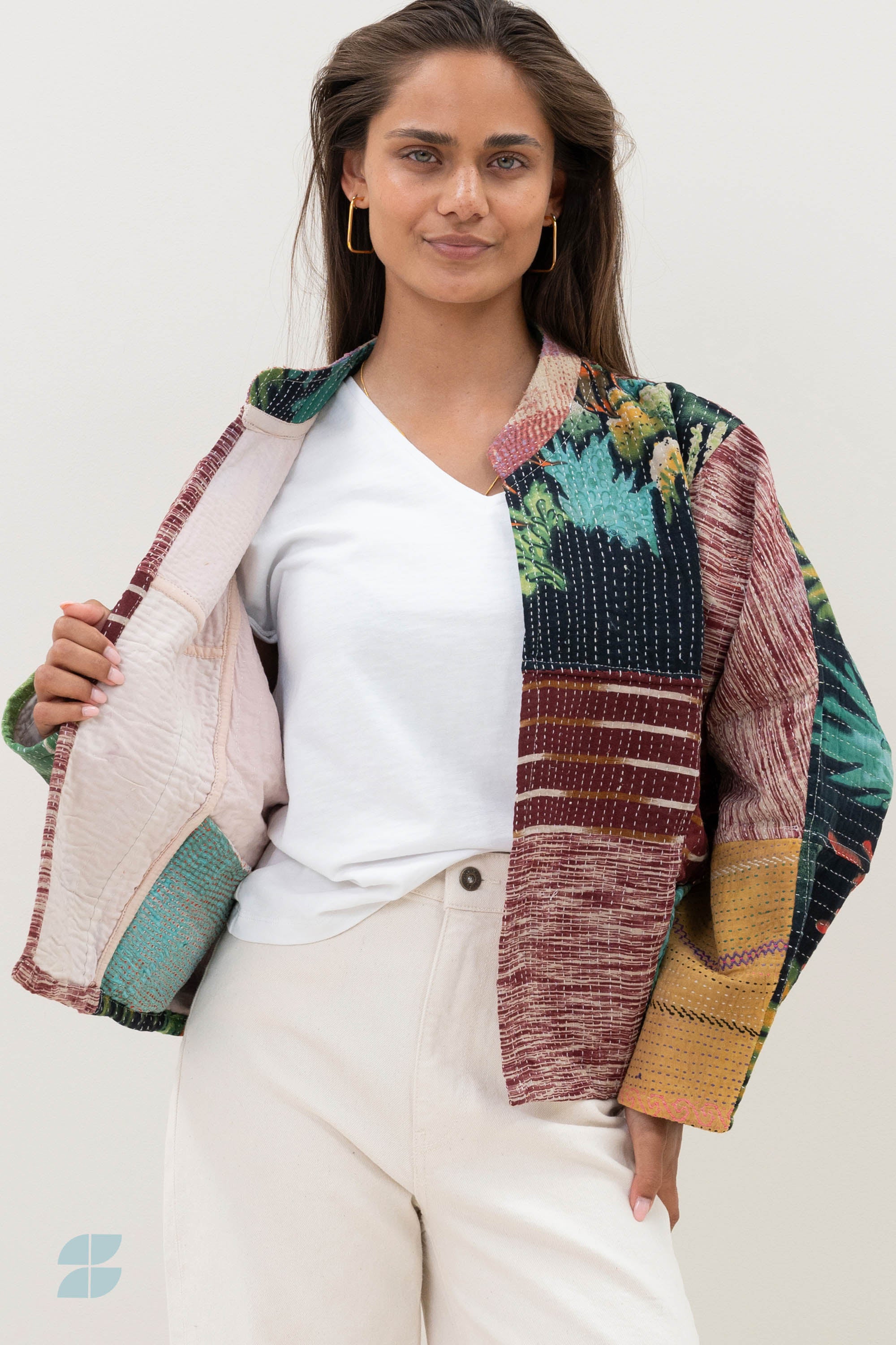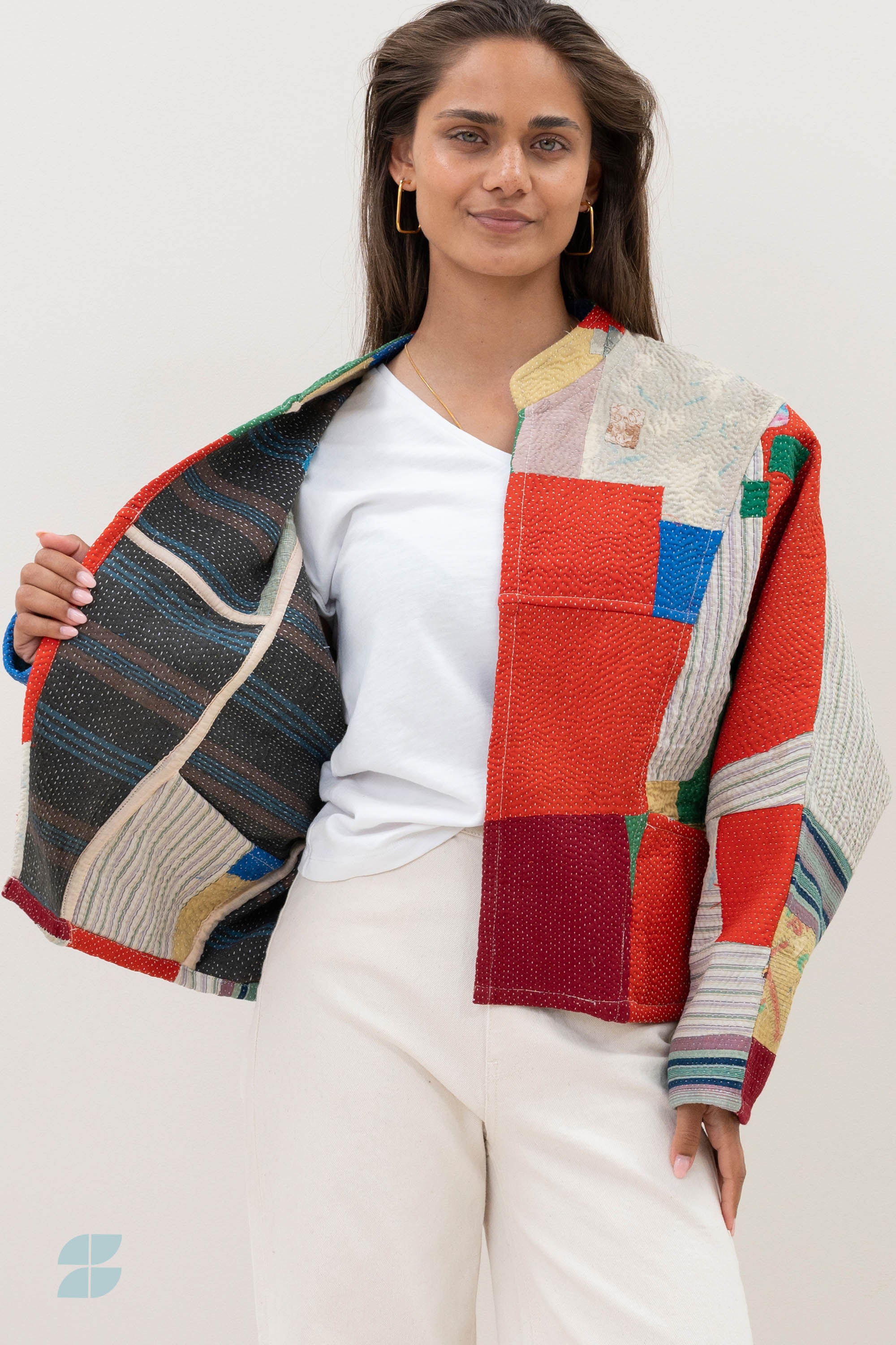 A timeless statement with a story. Our blossom antic jacket is a one-of-a-kind addition to your wardrobe, crafted from upcycled cotton saris once worn by Indian women. These saris are repurposed into blankets before being transformed into stylish and conscious jackets. Each Blossom Antic Jacket is unique, featuring its own character and print—no two are alike. The design features a round neckline, long sleeves, and a relaxed silhouette with dropped shoulders for an effortless fit. Thanks to its reversible design, you can wear it on both sides for a versatile look. Simply remove the neck label with a seam ripper and enjoy both sides of this unique piece. Handmade with respect for craftsmanship and circularity, this jacket is not only a conscious choice but also a celebration of slow fashion.