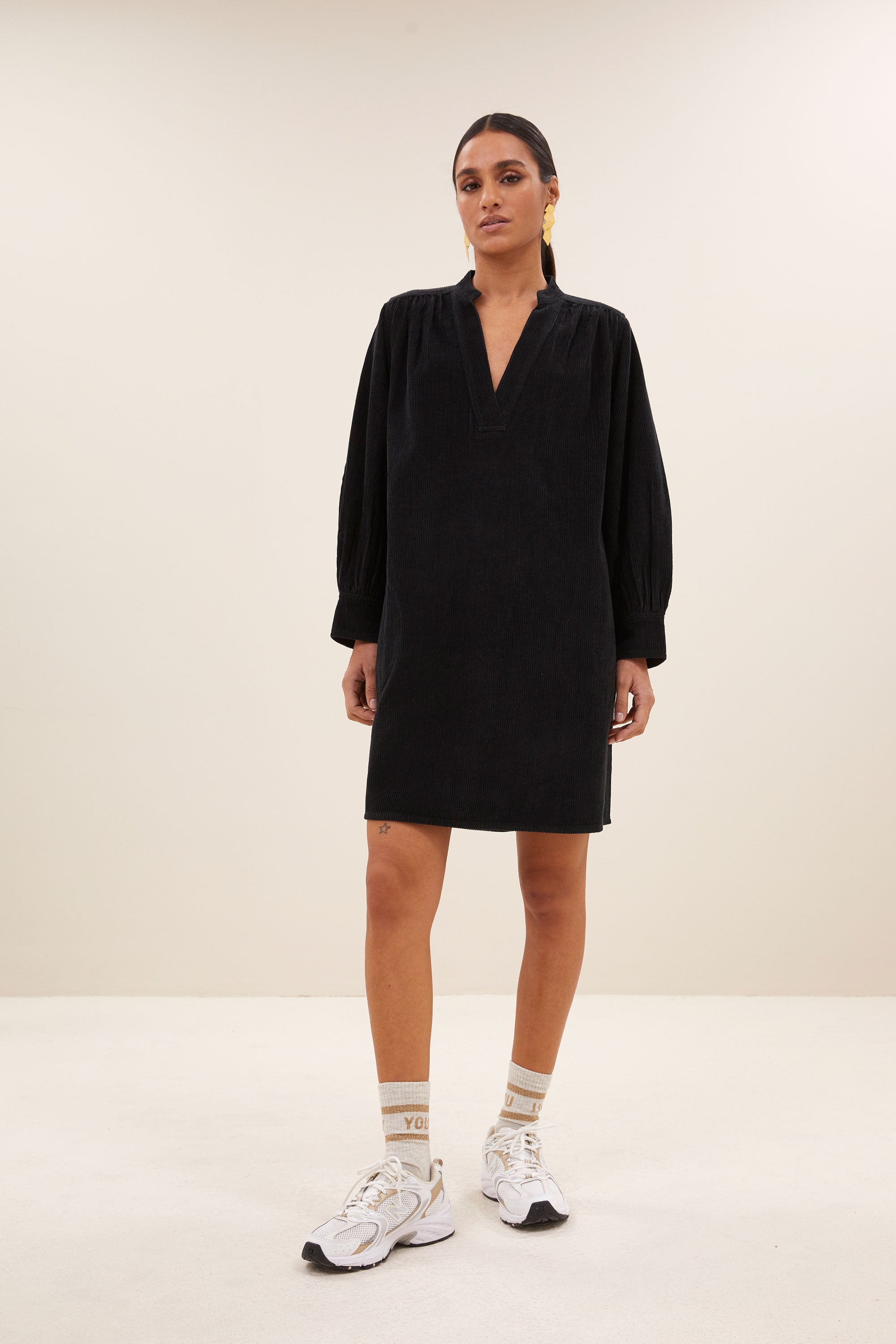 La jina cord dress est une robe décontractée avec une coupe confortable et ample et un décolleté en V flatteur. Sa longueur midi et ses détails plissés lui donnent une touche ludique, tandis que le motif côtelé apporte une texture unique. Avec ses manches longues et ses poches latérales pratiques, cette robe est parfaite pour toutes les journées où vous souhaitez allier style et confort.