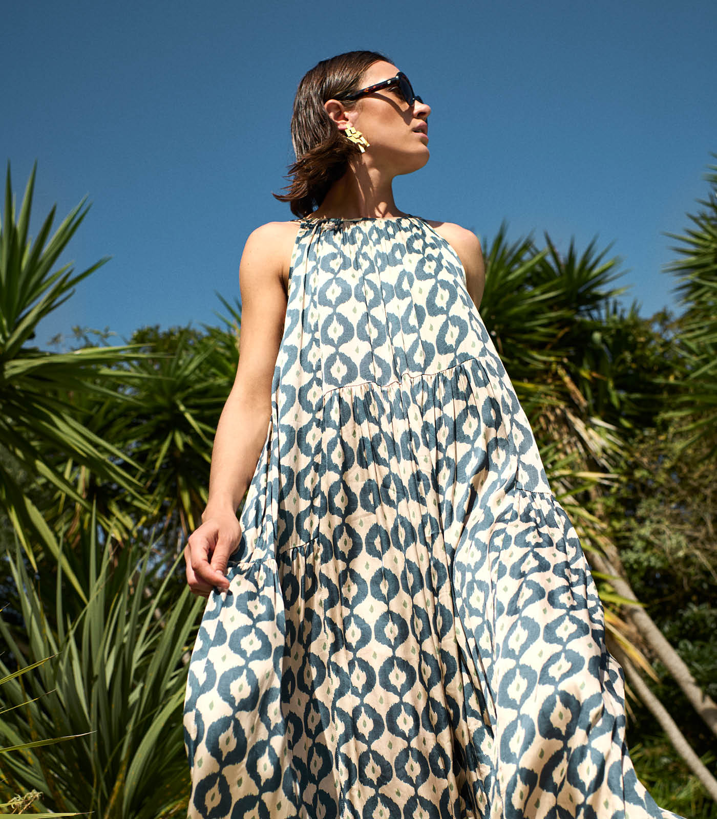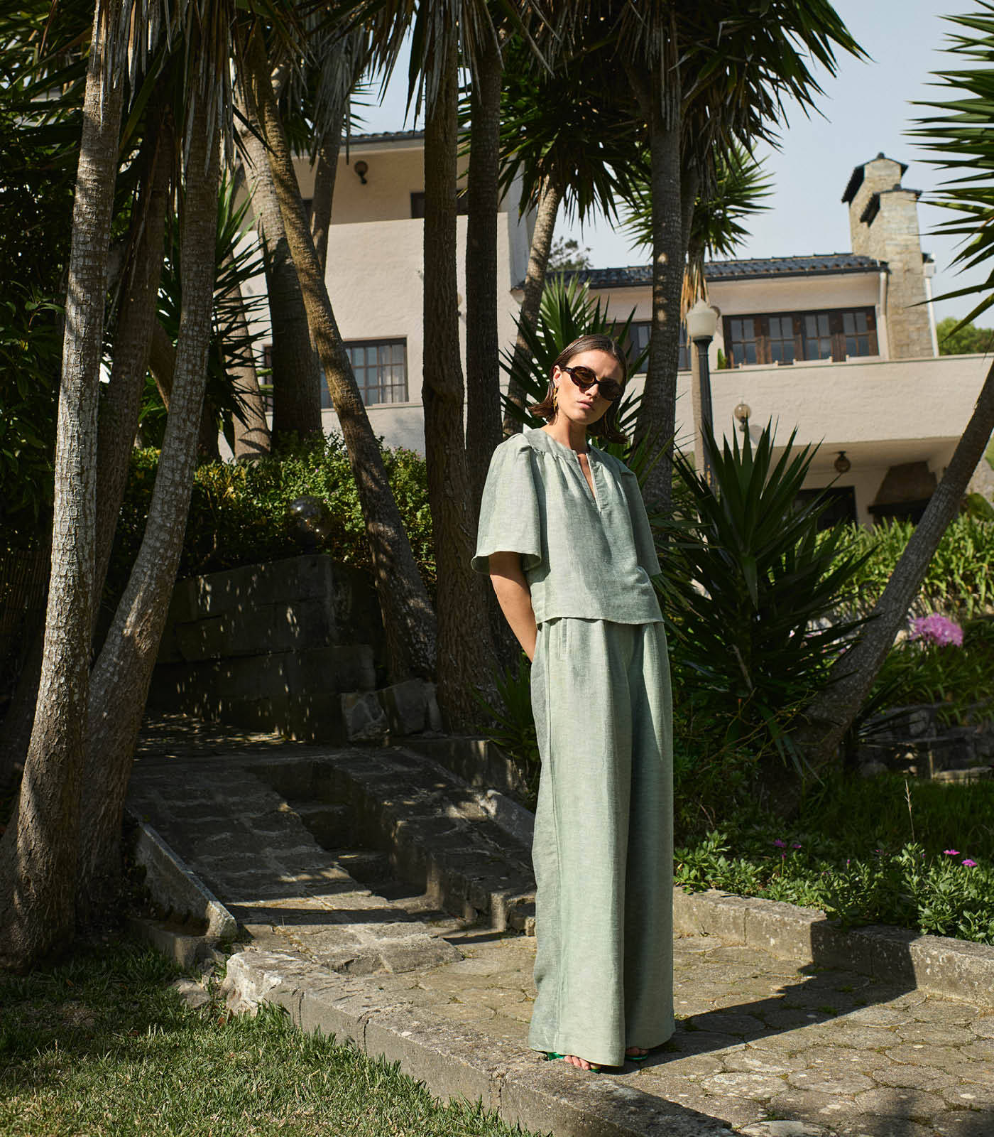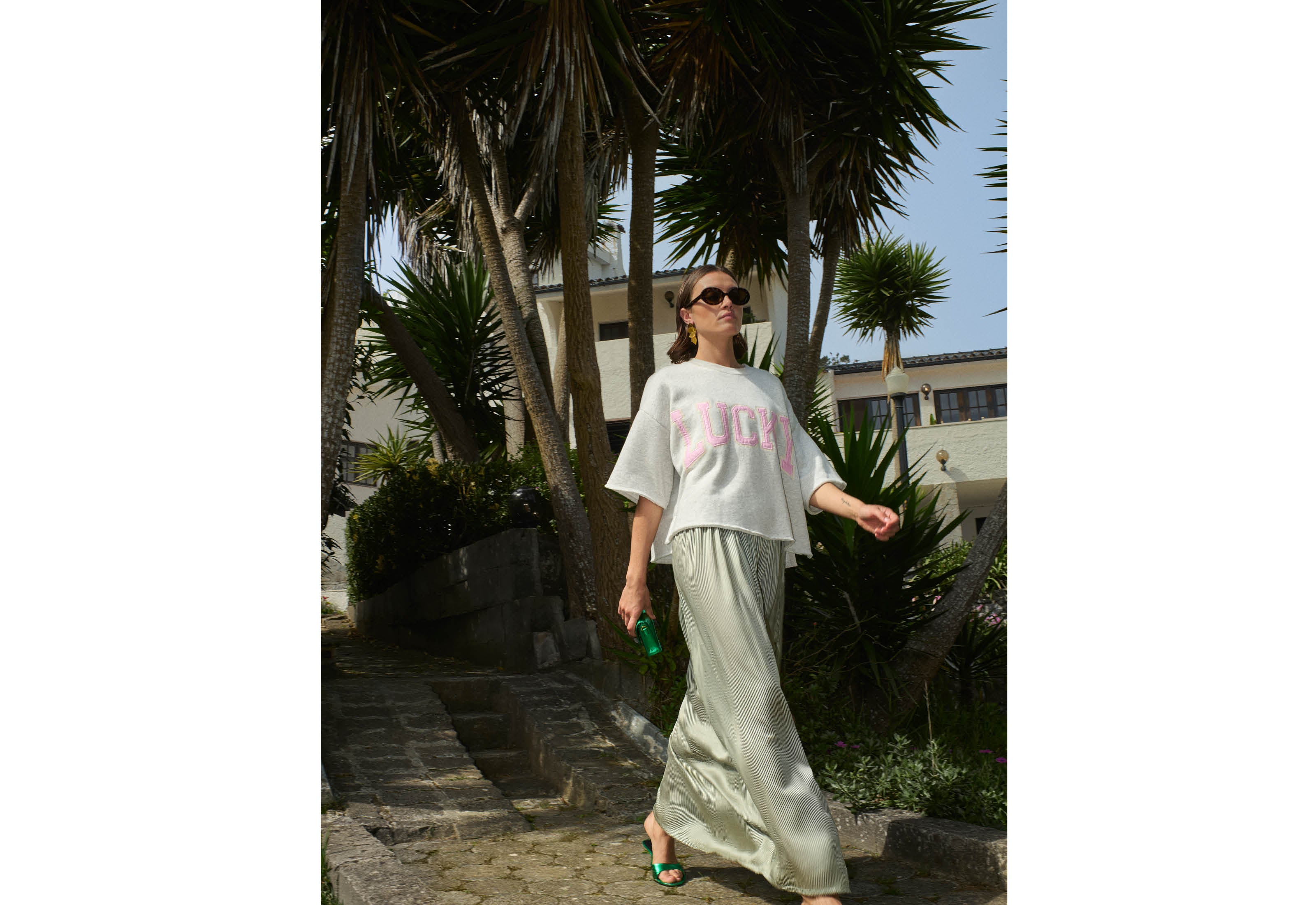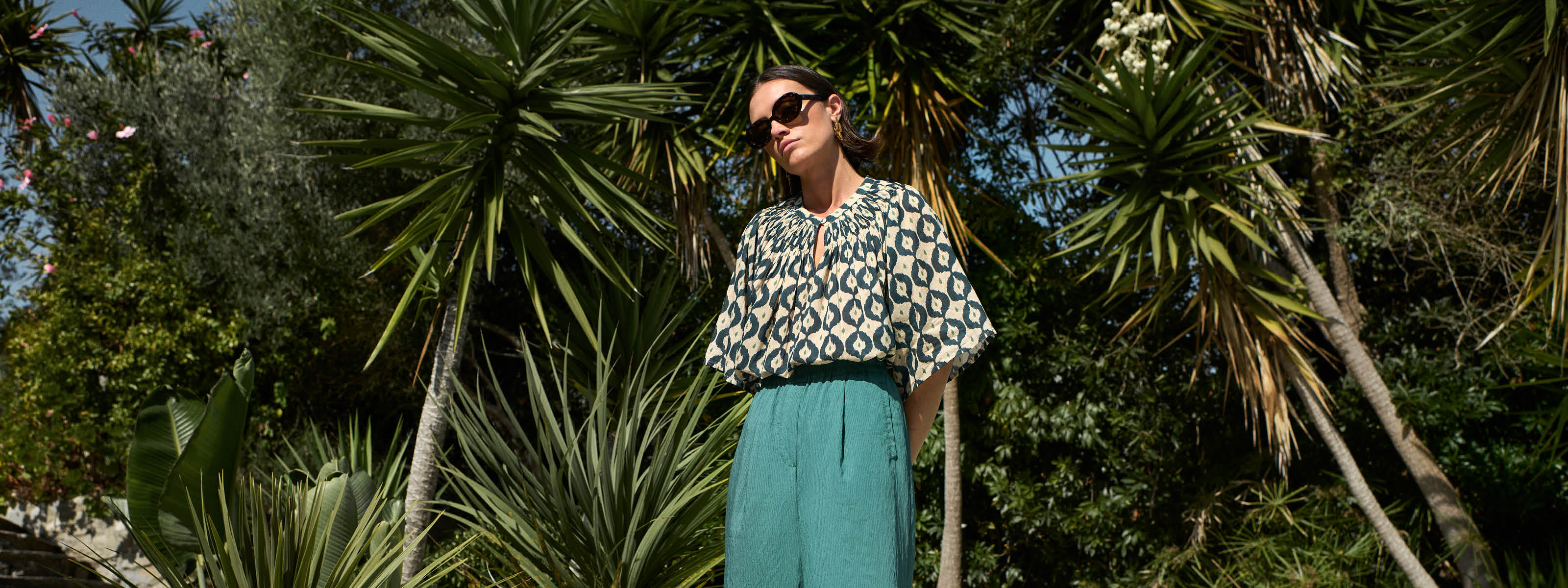 Bold Bloom is about expression. Greens and pinks come into focus through refreshing prints, framed by palms and warm summer light. The collection draws from vintage resort moments, afternoons by the pool, shaded terraces, sunlit paths lined with tiles and greenery.