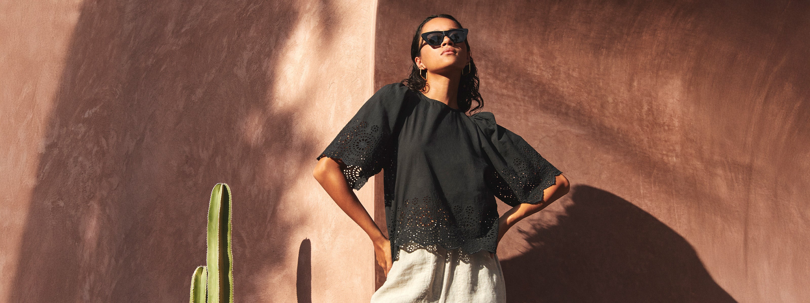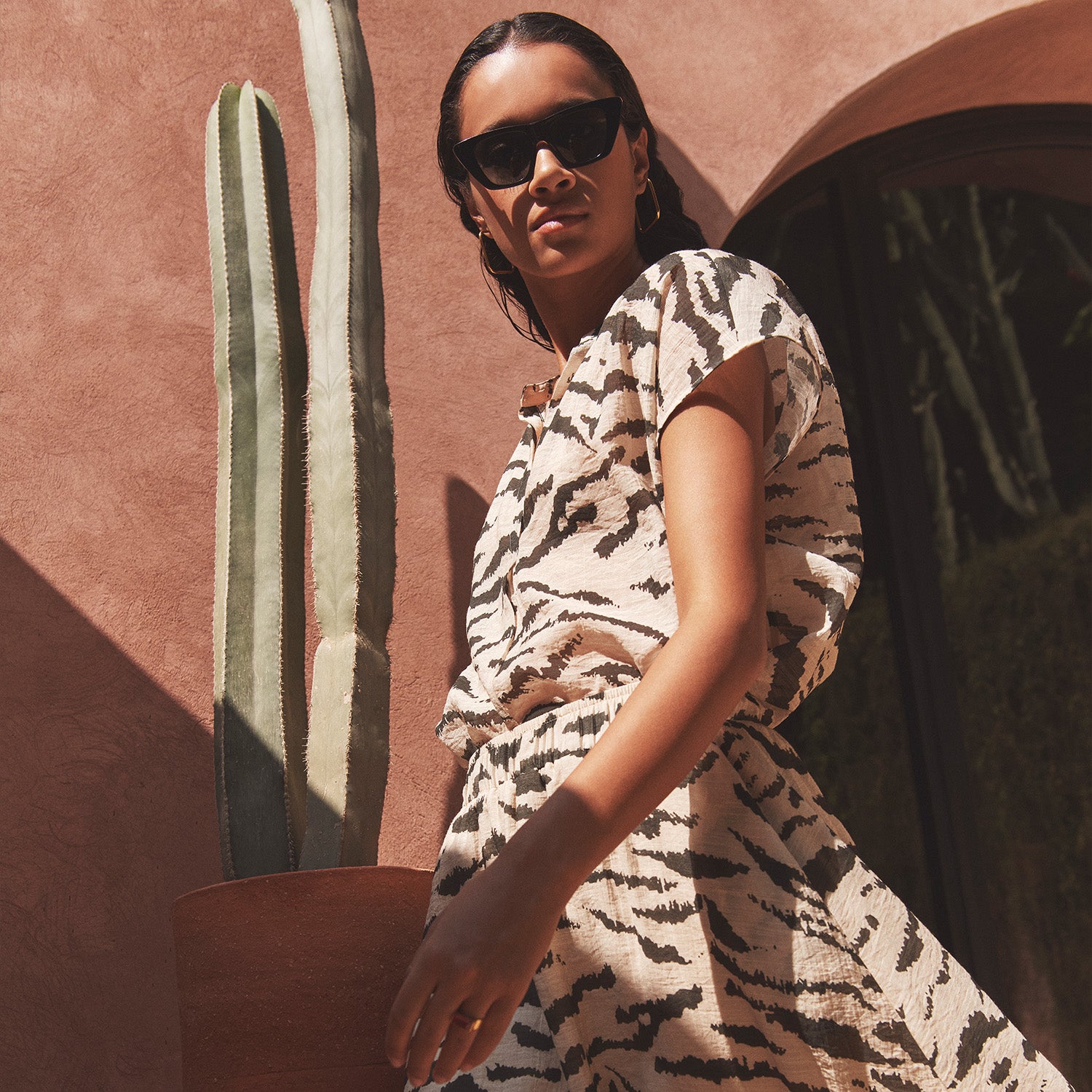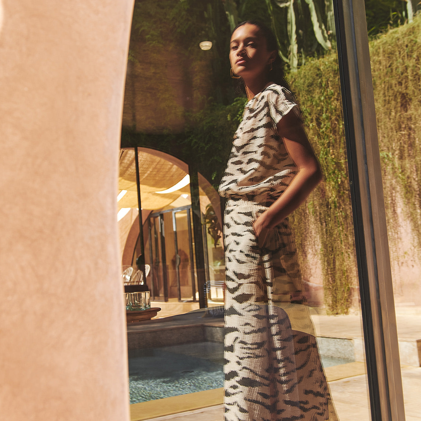 Powerful silhouettes take centre stage, an effortlessly structured linen suit, delicately embroidered tops, and flowing dresses exude understated confidence. Bold animal prints blend with soft, earthy tones, while relaxed shorts and wide-leg trousers paired with matching tops create a refined yet laid-back sophistication. The black Lucky Top adds a timeless, statement touch.
