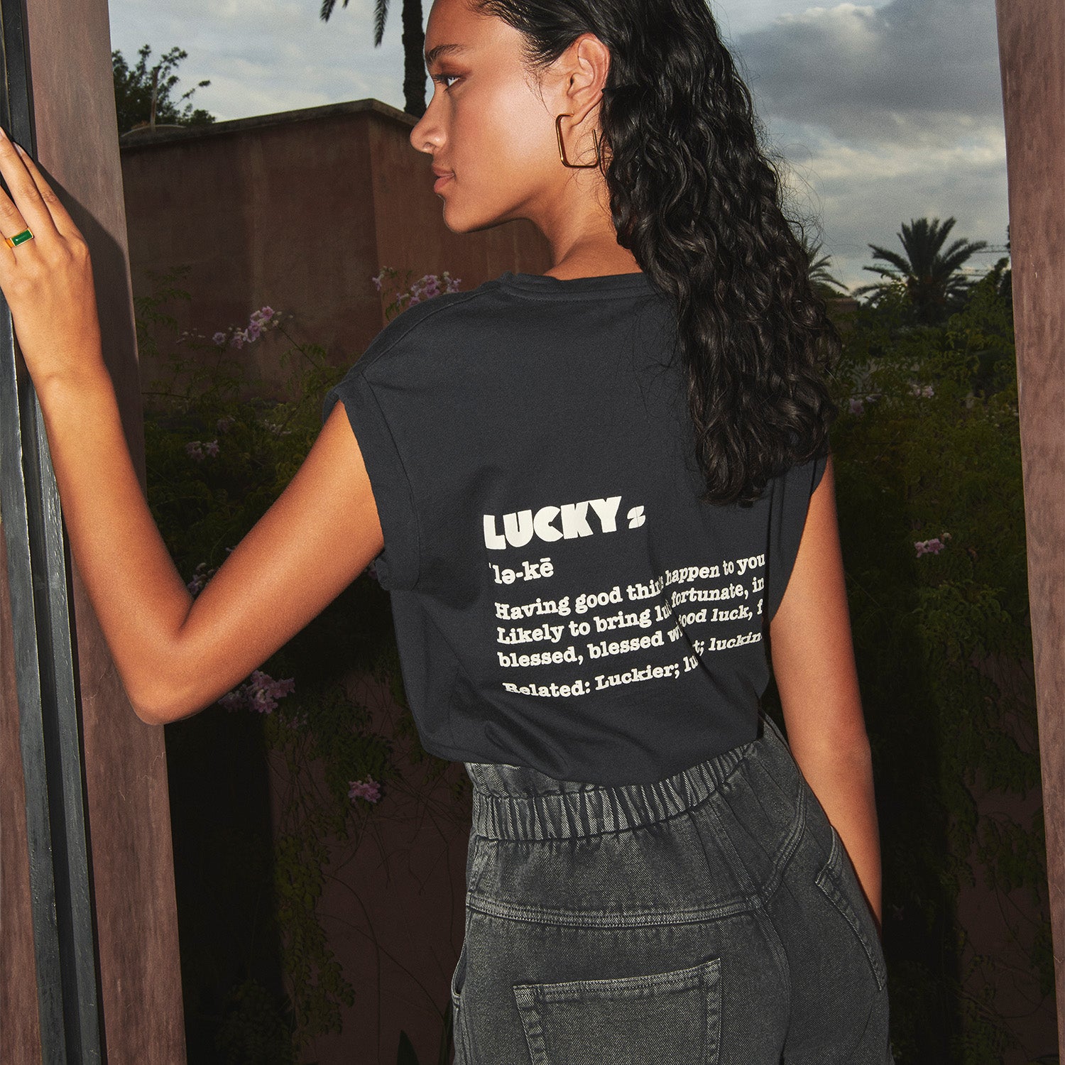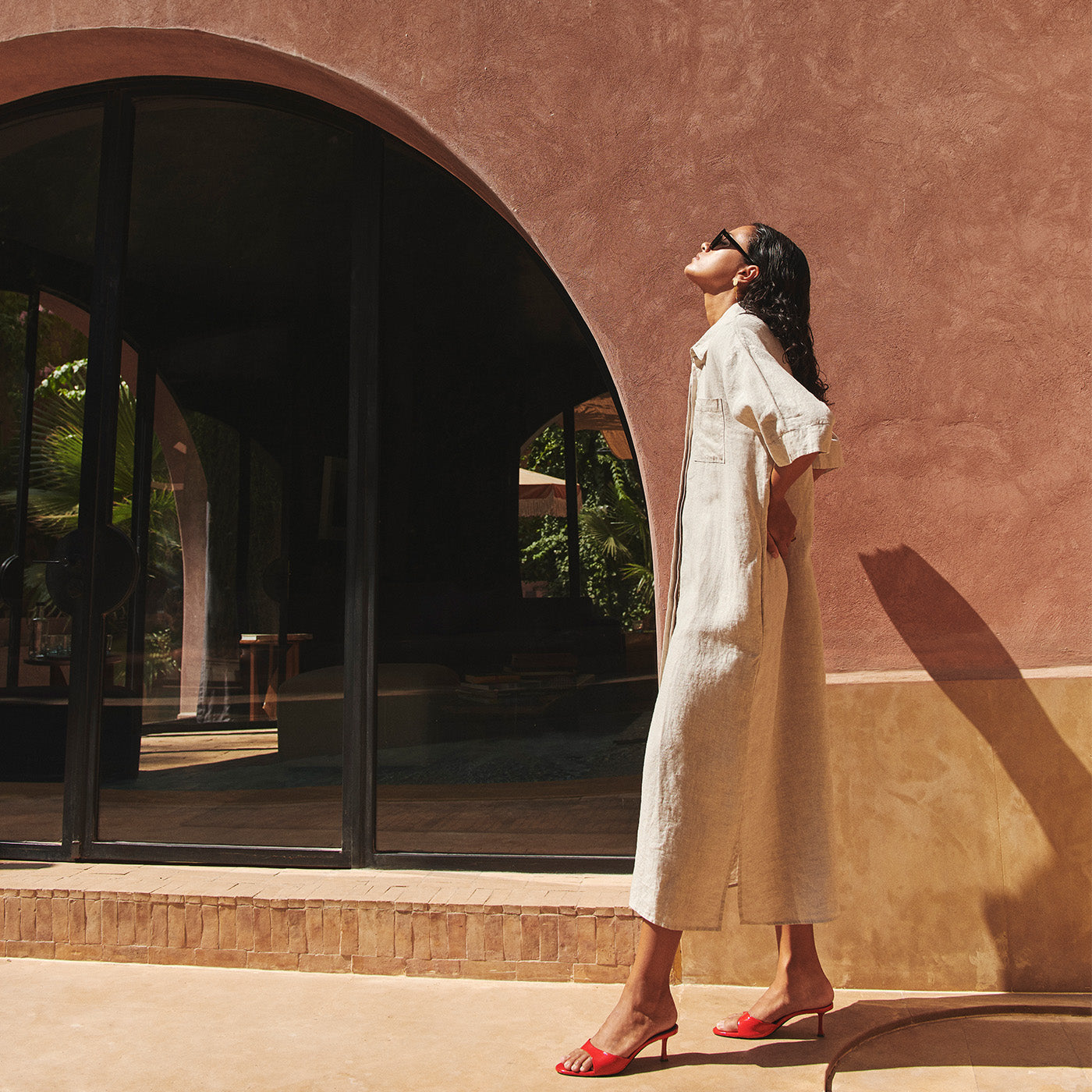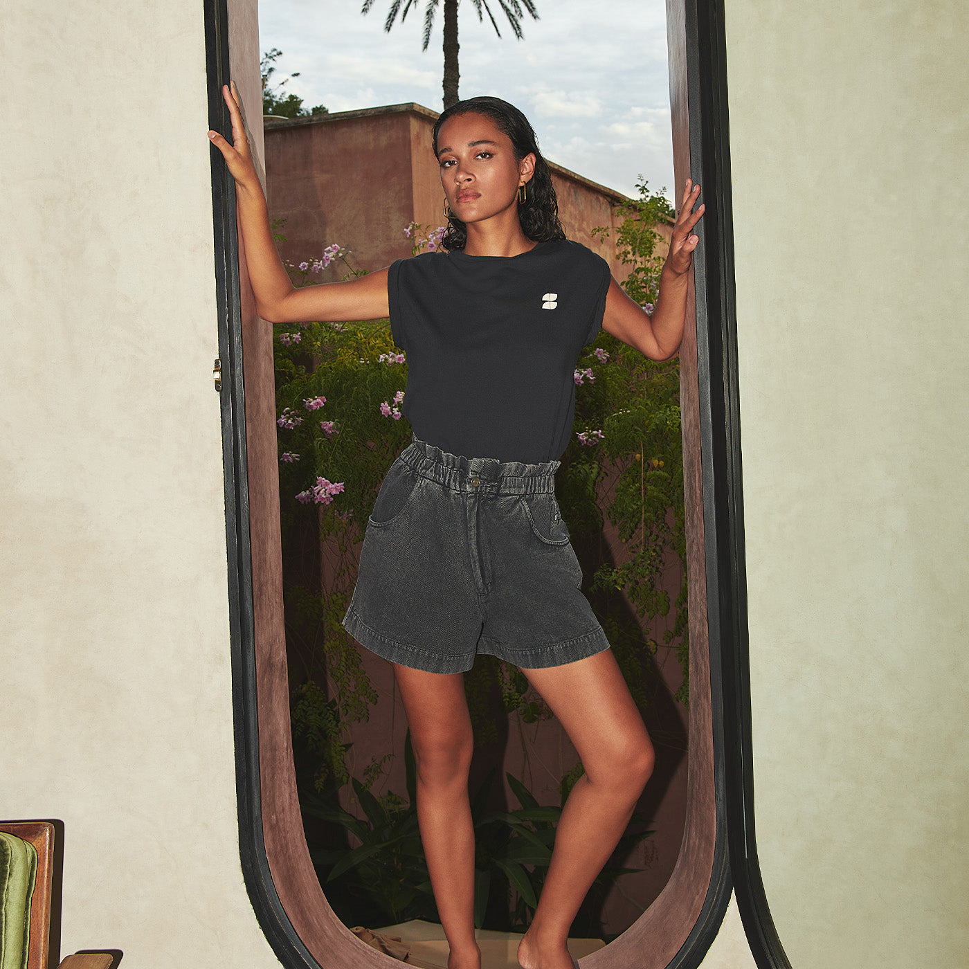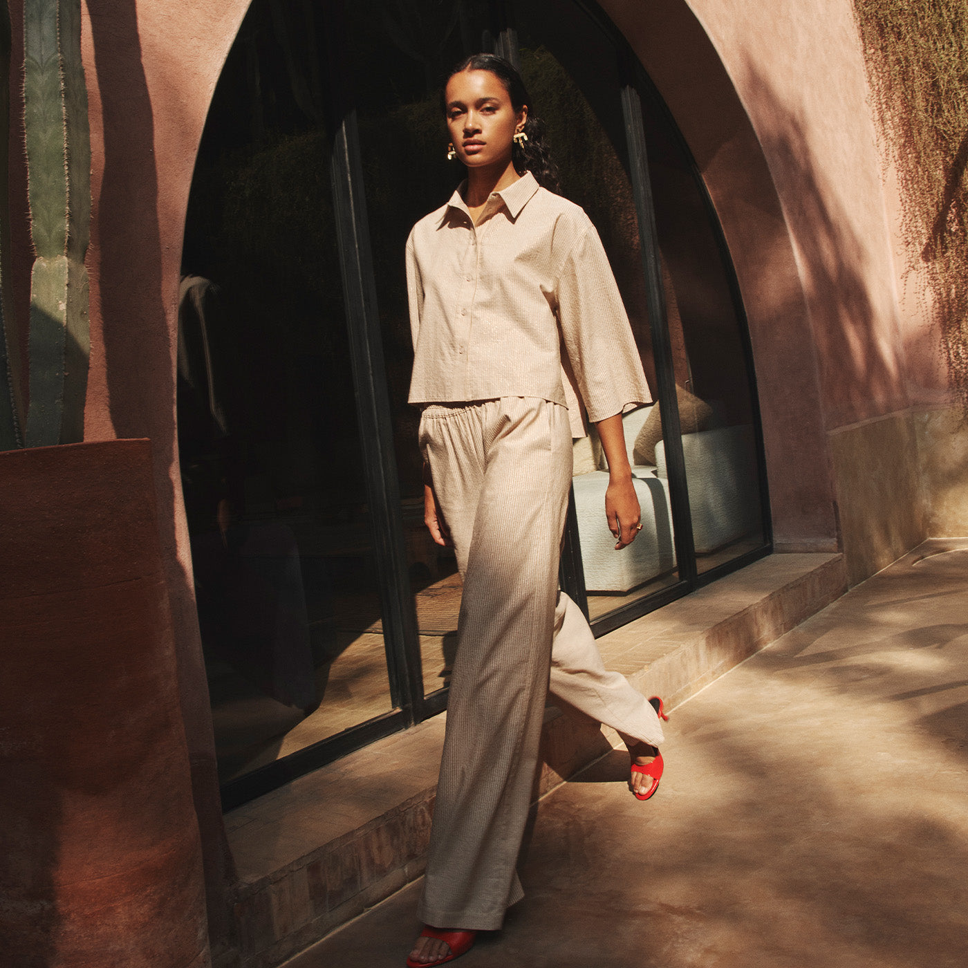 Powerful silhouettes take centre stage, an effortlessly structured linen suit, delicately embroidered tops, and flowing dresses exude understated confidence. Bold animal prints blend with soft, earthy tones, while relaxed shorts and wide-leg trousers paired with matching tops create a refined yet laid-back sophistication. The black Lucky Top adds a timeless, statement touch.