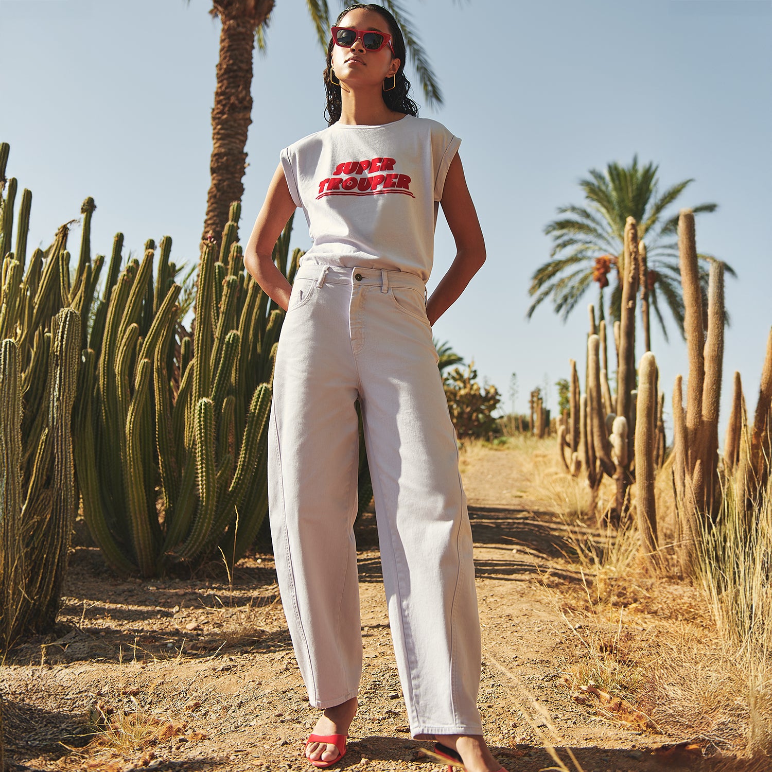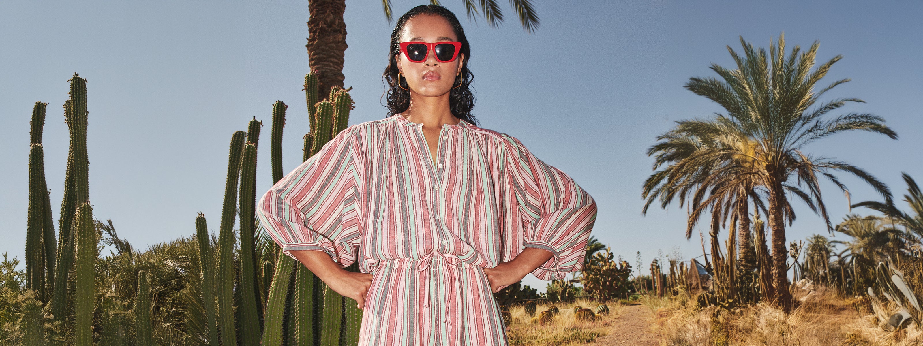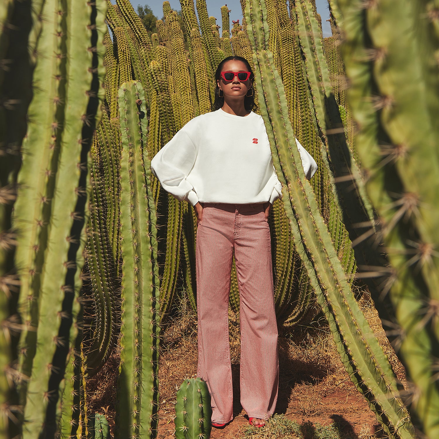 Amongst the towering cacti, the warmth of the Moroccan sun envelops everything in its glow, blending nature’s untamed beauty with effortless elegance.