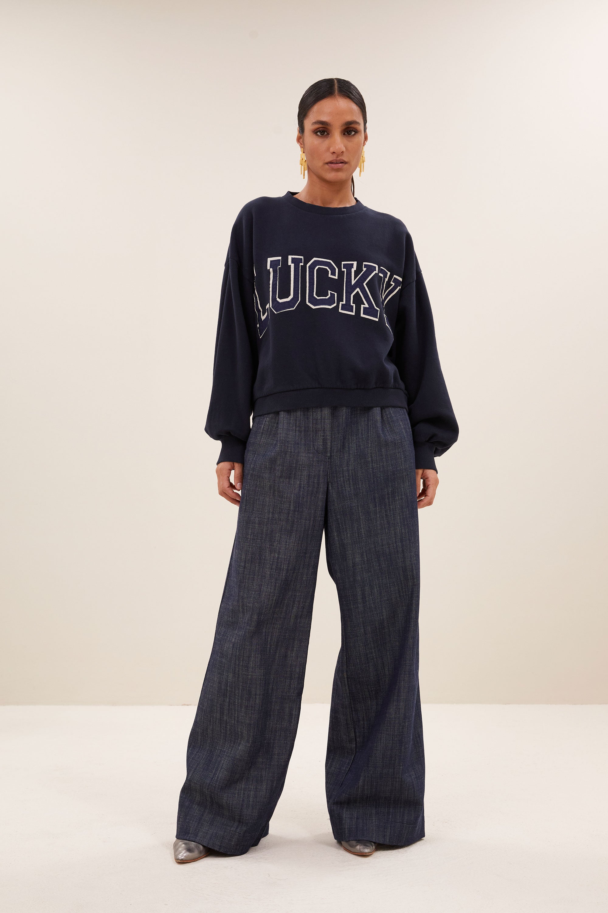 bibi patchwork sweater - midnight, katoen kwaliteit, verlaagde schoudernaden, statement print - by-bar - detail