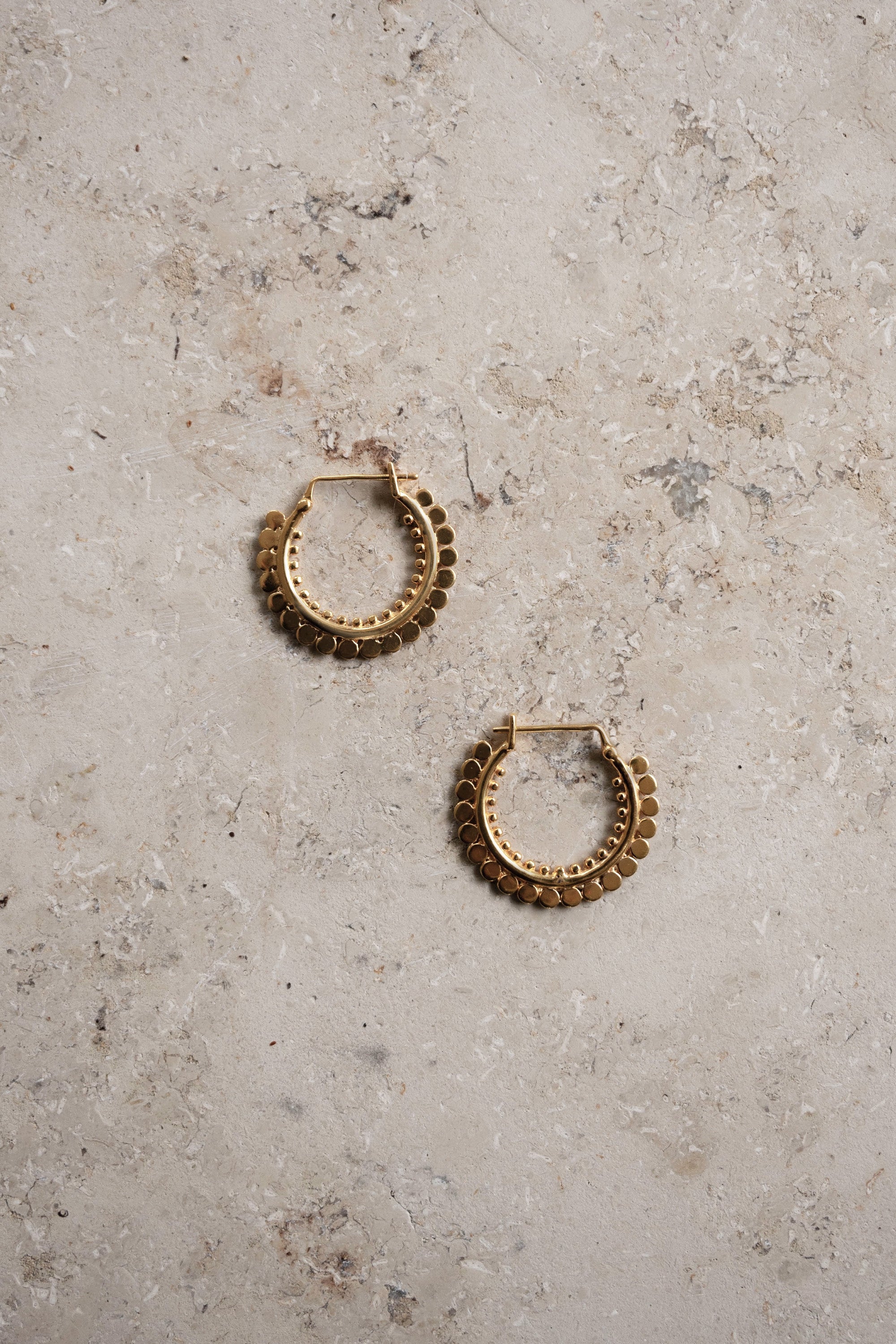 Aan de tara earring zitten kleine ronde spikes wat de oorbellen een vlotte en zomerse uitstraling geeft. De oorbellen zijn gemaakt van nikkelvrij koper met een laagje 22K verguld goud. De oorbel is 2.5 cm en wordt verkocht als set.